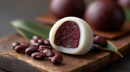 A beautifully crafted Japanese dessert featuring soft rice cake filled with sweet red bean paste, complemented by adzuki beans, perfect for any food lover.