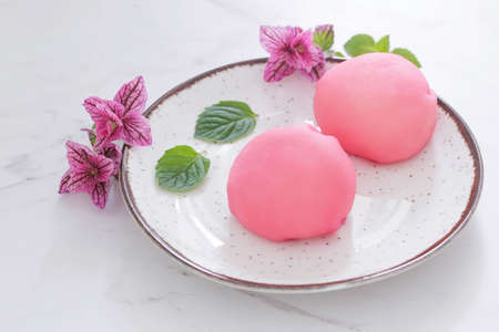 Delicious sweet chilled mochi desserts with fruit filling and rice dough coating