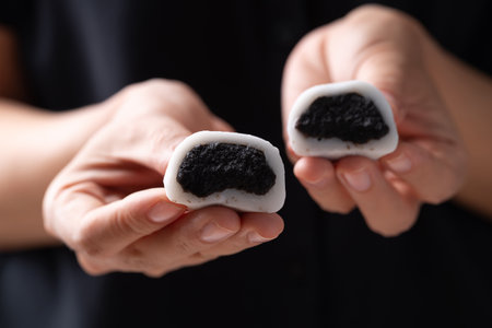 Daifuku mochi (Traditional Japanese sweet) stuffed with black sesame seed holding by hand and eating