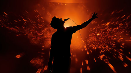 Confident male singer is illuminated by blue and orange stage lights while performing for a crowd