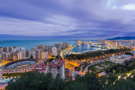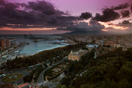 View of the Malaga city, Spain. Aerial view of City Hall and port with illuminated buildings and dramatic sunset sky.