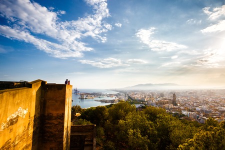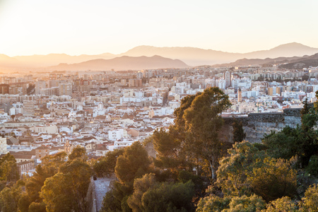 Panorama of the town of Malaga with the fortress wall. At the end of day.