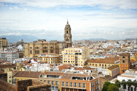 Malaga, seaside city in Andalusia, Spain, Europe. Aerial view of a city with a large cathedral and numerous buildings.
