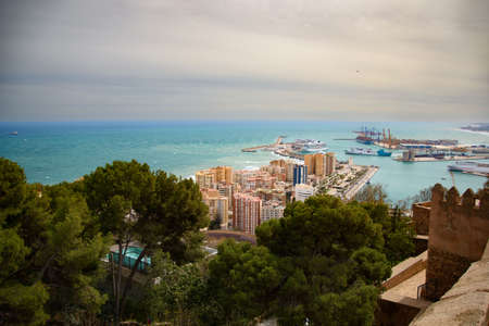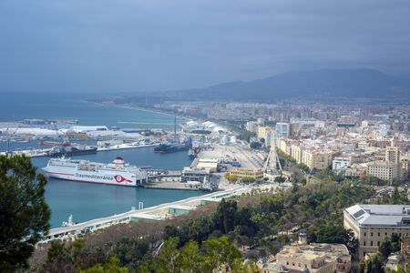 Malaga, Spain, February 2019. Panorama of the Spanish city of Malaga. Buildings, port, bay, ships and mountains against a cloudy sky. Dramatic sky over the city. Beautiful view.