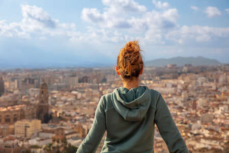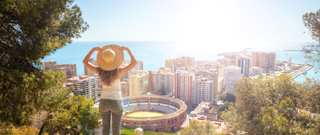 Rear view of young woman traveller with white hat standing in Gibralfaro Castle viewpoint and looking at Malaga cityscape. Summer holiday vacation in Spain