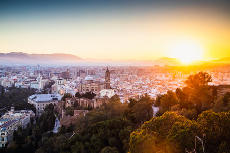 Sunset from the walls of the Alcazaba of the city of Malaga and in the background the Cathedral of the Incarnation of Malaga, Andalusia. Spain. Medieval fortress in arabic style