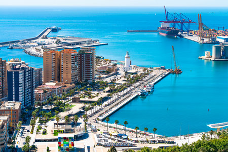 MALAGA, SPAIN - SEPTEMBER 27, 2018. Aerial view of city seaport