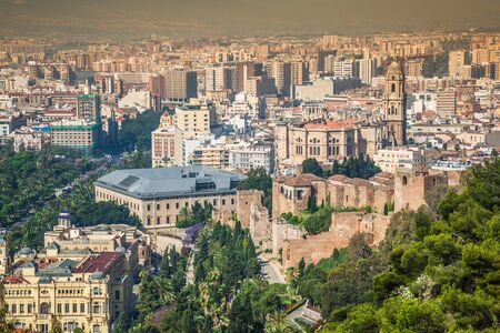 City Council Building in Malaga. Aerial view of Malaga taken from Gibralfaro castle including port of Malaga, Alcazaba castle and the Cathedral, Andalucia, Spain.