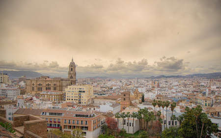 Malaga, Spain, February 2019. Panorama of the Spanish city of Malaga. Buildings against a cloudy sky. Dramatic sky over the city. Beautiful view.