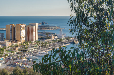 Panorama of Malaga city with modern districts, port, coast and city park from the Gibralfaro hill, Costa del Sol, Spain
