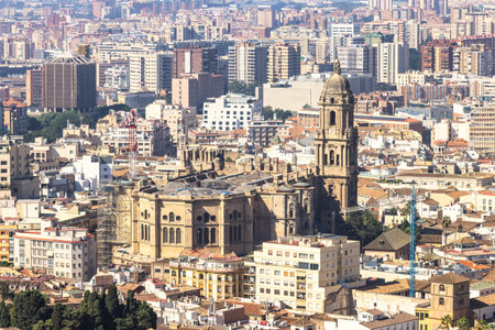 Malaga, Spain - September 08, 2015: View of the Santa Iglesia Cathedral Basilica of Lady of Incarnation, port and cityscape of Malagafrom Castillo de Gibralfaro height, Spain