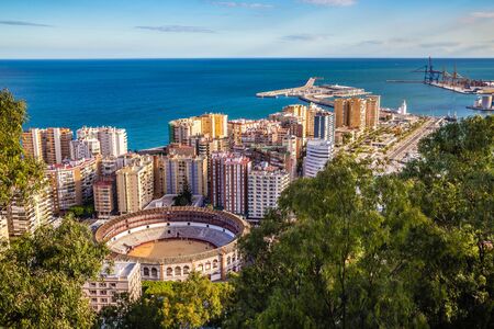 Malaga / Spain - October 2019: Landscape city view. Popular touristic destination. Overlooking the whole town: bull ring, harbour with cruise ships and boats, buildings and Mediterranean sea.