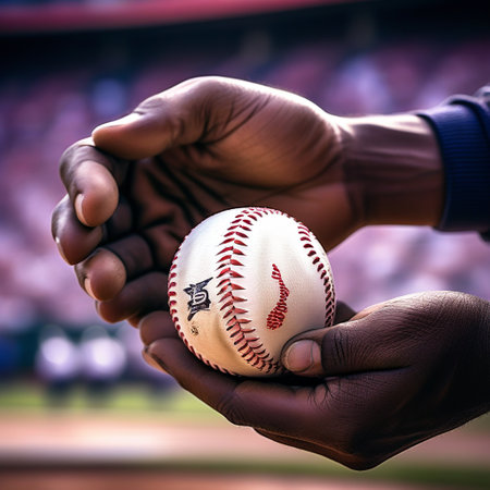 The distinct pattern of a baseball in the foreground with the diamond and spectators in a dreamy blur, capturing the American spirit and the tactical play of baseball.