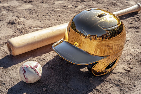 Closeup of a glaming golden baseball helmet on a dusty field with bat and ball under sunny skies