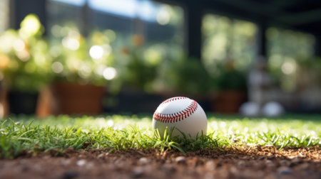 A close-up view of a worn baseball resting on a lush green grass field, illuminated by soft light. The image captures the essence of summer sports and outdoor activities.