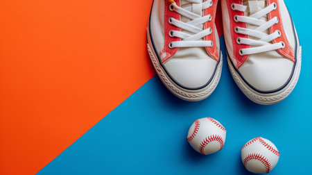 baseball ball and sneakers on minimalist vivid background with copy space.