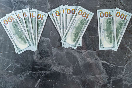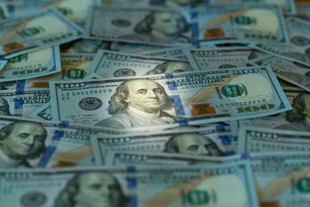 Top view of one hundred dollar banknotes made as a background. USD currency concept. Texture of American dollars close up