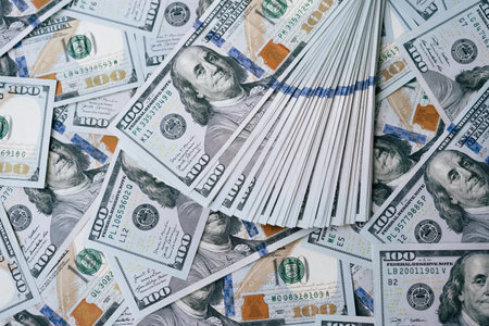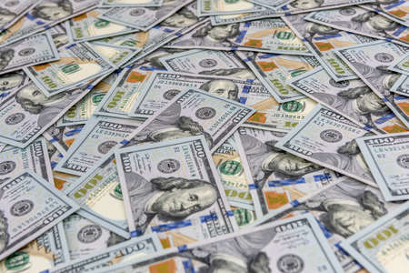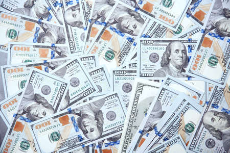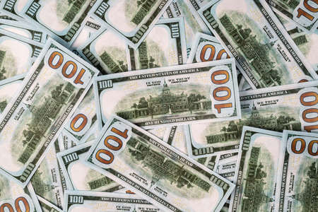Top view of one hundred dollar banknotes made as a background. USD currency concept. Texture of American dollars.
