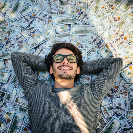 Man lies on money with a smile in a high angle view under bright light in an indoor setting in the afternoon
