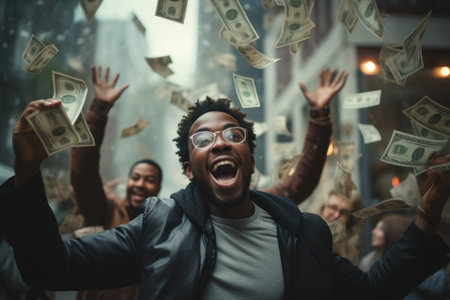 Happy person getting bonus money and banknotes flying in the air and get lucky rich and financial freedom comeliness