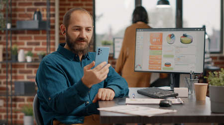 Employee holding smartphone to talk on video call with colleagues in startup office. Business man using remote video conference to have conversation with workmates about project strategy.