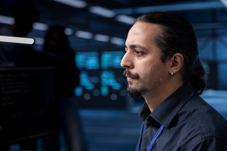 IT developer in data center updating systems to protect servers from exploitable software vulnerabilities. Close up shot of man looking for errors causing equipment to slow down