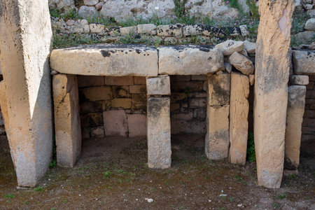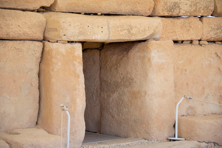 Door and window view of ancient limestone structures of Hagar Qim and Gnajdra Temples in Qrendi, Malta.