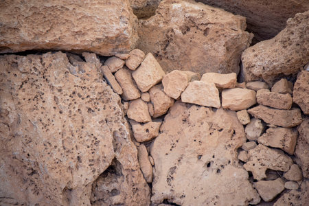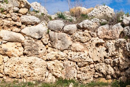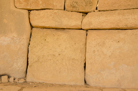 Detailed view of ancient limestone structures of Hagar Qim and Gnajdra Temples in Qrendi, Malta.