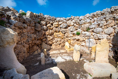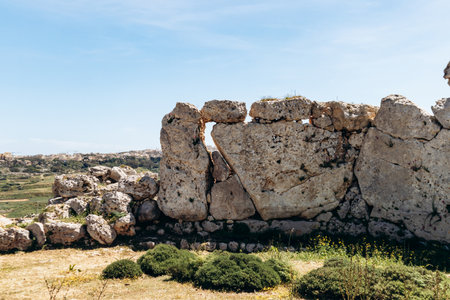 Ancient megalithic Ä gantija Temples, a UNESCO World Heritage site on Xagħra plateau, featuring massive limestone blocks and original Neolithic stone architecture under a clear spring sky
