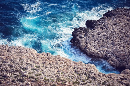 beautiful deserted landscape rocky seashore, blue waves background