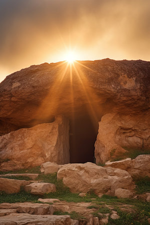 Sunset at the entrance to a cave in the desert of Egypt