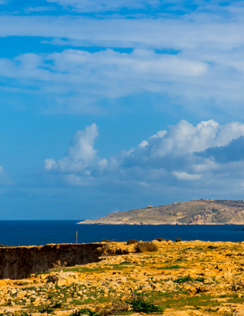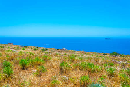 Mediterranean sea view from the cliffs on the Marfa peninsula. Malta Island.