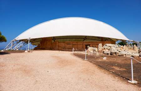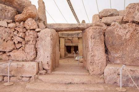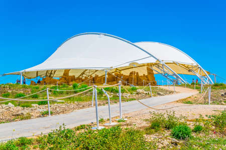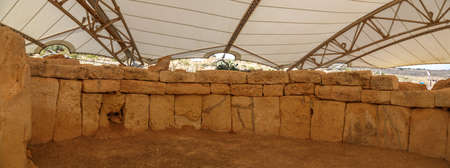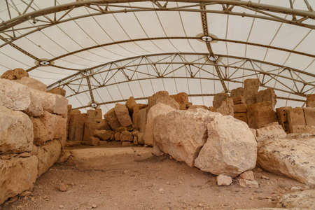 QRENDI, MALTA - JULY 28, 2015: Hagar Qim is the megalithic temple of Malta. The prehistoric ruins are covered by protective tent to preserve the limestone from severe weathering and surface flaking.