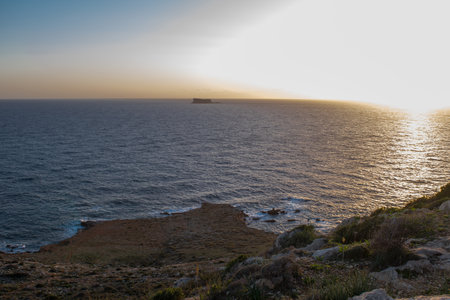 Peaceful beautiful sunset with few clouds along the coast of Qrendi, Malta, with the island of Filfla in the distance and the sun setting in horizon.