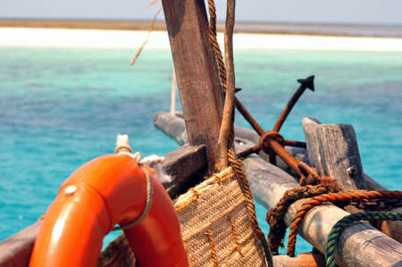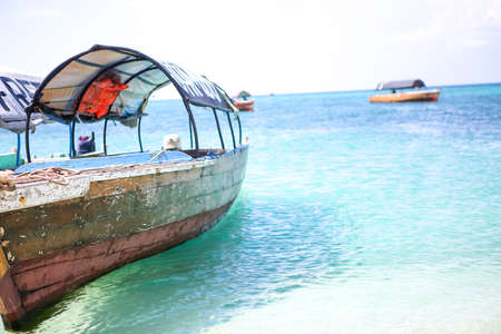 Fishing ship with local fishermans in water of Indian ocean. Zanzibar, Tanzania.