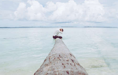 Man walking on sand seabed of beautiful turquoise sea. Tourist enjoying beach holiday.