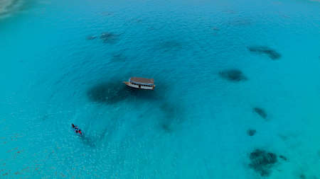 Aerial view of the fishing boat in transparent blue water at sunny day in summer. Top view from above of boat, sandy beach. Indian ocean in Zanzibar, Africa. Landscape with canoe and clear sea. Travel