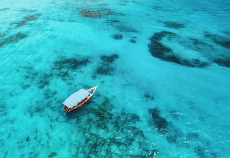 Aerial view of the fishing boat in transparent blue water at sunny day in summer. Top view from drone of floating boat in Indian ocean in Zanzibar, Africa. Landscape with yacht in clear sea. Seascape
