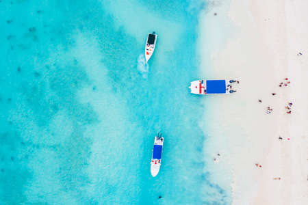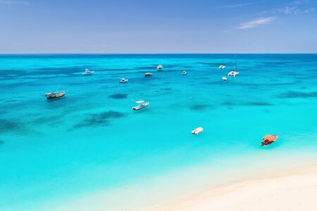 Aerial view of the fishing boat and yacht in clear blue sea at sunset in summer. Top view from drone of yachts, sandy beach. Travel in Zanzibar, Africa. Tropical landscape with motorboat, water