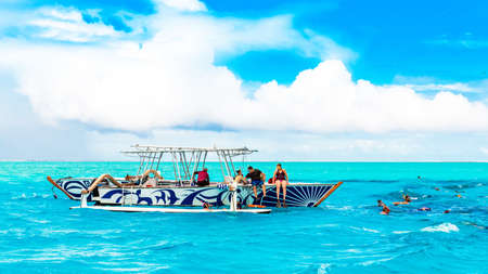 BORA BORA, FRENCH POLYNESIA - SEPTEMBER 19, 2018: Group of tourists in the boat