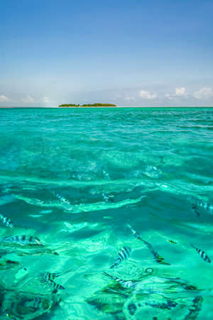 Beautiful underwater view with some tropical fishes of lone small island above the water surface in turquoise waters of tropical ocean.