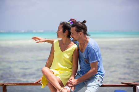 Beautiful couple of lovers sit on the railing against the background of the azure sea and look into the distance