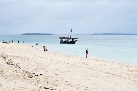 Kendwa, Tanzania - October 5, 2019: White sandy beach and boats on a coast in Kendwa resort shown at morning, Zanzibar, Tanzania, Africa