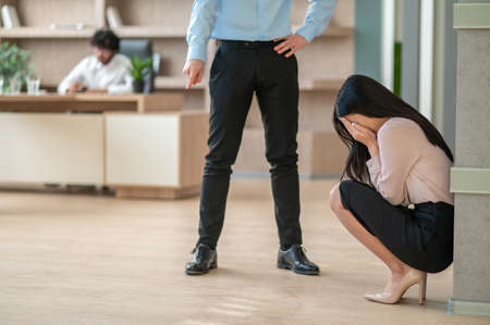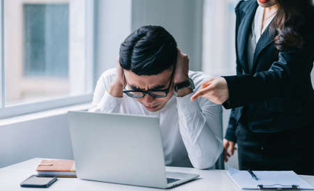 Tired and bored young Asian businesswoman or female office worker getting a complain from her male boss in the office about her work performance.