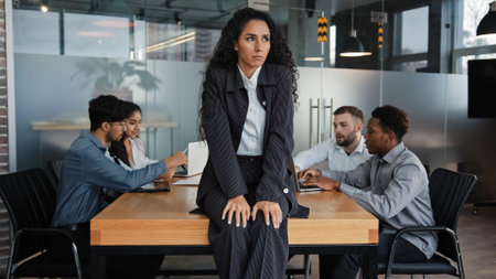 Worried sad upset leader woman worker businesswoman sitting on table in conference room thinking about business problem multicultural team colleagues in background discussing work project teamwork