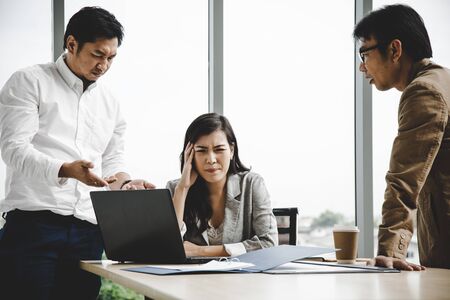 Sadness businesswoman sitting at the table while her colleagues pointing at her and blame her for the failed conference