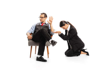 Portrait of man, office manager and woman, employee isolated over white studio background. Secretary and boss. Concept of business, office lifestyle, success, ballet, control, expression, ad