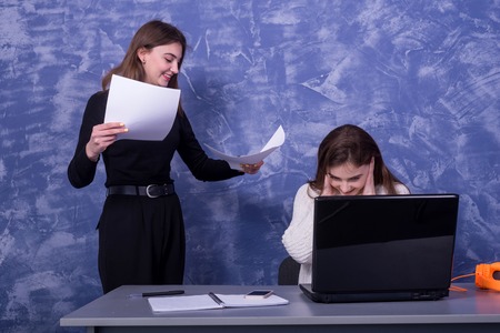 Portrait of a female worker showing failure at work and being reprimanded by a colleague.