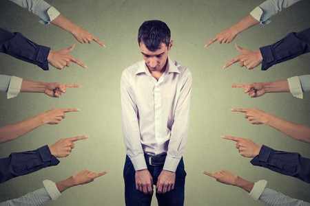 many hands pointing the bullying a business man that is suffering mobbing on concept of accusation guilty shy