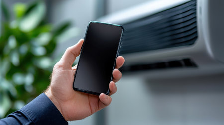 A person holds a blank smartphone in front of a sleek air conditioning unit mounted on a wall. The setting is modern with a hint of greenery nearby.